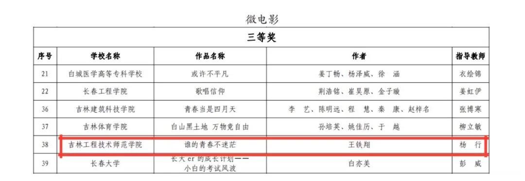 在第六届“吉林省大学生网络文化节”评选结果中,由王俊、王瑞雪、莫婷制作的《战疫路上 老师与你们同在》获微视频赛道一等奖;由李莫垚、刘诗雨、王瑞雪、莫婷制作的《2022·毕业季》,由邹婷、王瑞雪、莫婷制作的《画笔颂英雄》获微视频赛道二等奖;由符阳侯拍摄的《品悟生活》获摄影赛道二等奖;由柴桂芳撰写的《告诉她,青春,便是如此》,由程佳莹撰写的《白云苍狗 日新月异——教育之于我们》获网文赛道二等奖;由张晓帆、王瑞雪、莫婷制作的《光影·工师》获微视频赛道三等奖;由王铁翔制作的《谁的青春不迷茫》获微电影赛道三等奖;由朱志铖制作的《珍爱生命,远离香烟》获动漫赛道三等奖;由刘佳宁制作的《我的祖国》获音频赛道三等奖。