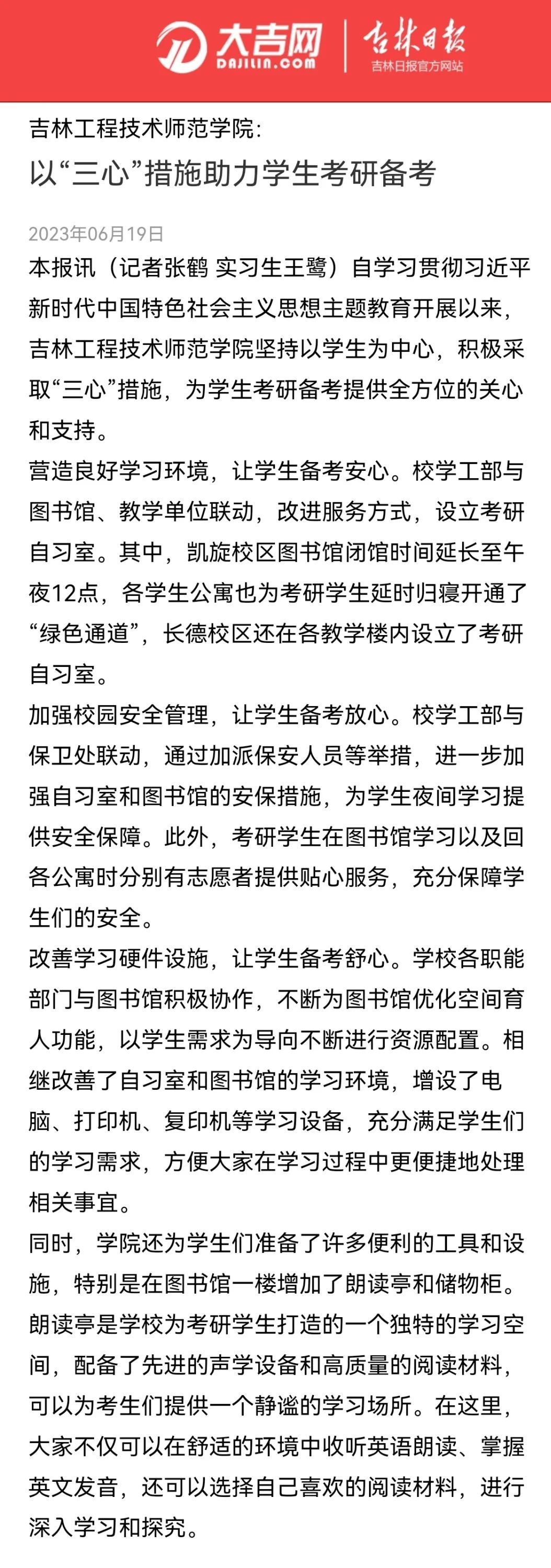 2023年6月19日,吉林日报对beat365官网主题教育学习成效:以“三心”措施助力学生考研备考进行报道。