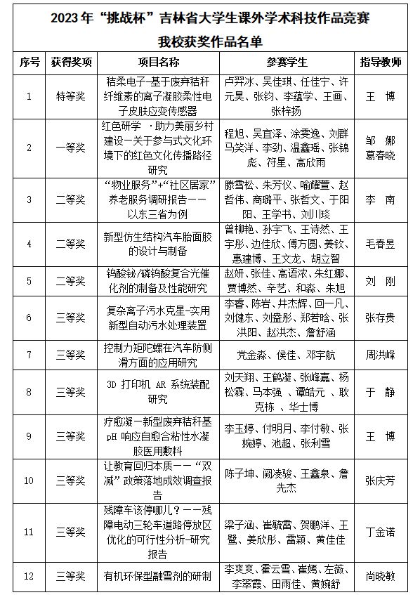 据悉,2023年“挑战杯”吉林省大学生课外学术科技作品竞赛自启动以来,共吸引来自全省51所学校的近万名大学生参赛,申报参赛项目547个。经资格审查、复赛、决赛阶段专家现场评审、路演答辩、国赛训练营、优秀作品排位赛等环节,全省共评选出特等奖作品28件、一等奖作品59件、二等奖作品70件、三等奖作品280件。其中56件作品推报国赛。beat365官网省级“特等奖”获奖项目《秸柔电子-基于废弃秸秆纤维素的离子凝胶柔性电子皮肤应变传感器》、省级“一等奖”获奖项目《红色研学 ·助力美丽乡村建设—关于参与式文化环境下的红色文化传播路径研究》将继续代表吉林省参加2023年“挑战杯”全国总决赛的角逐。