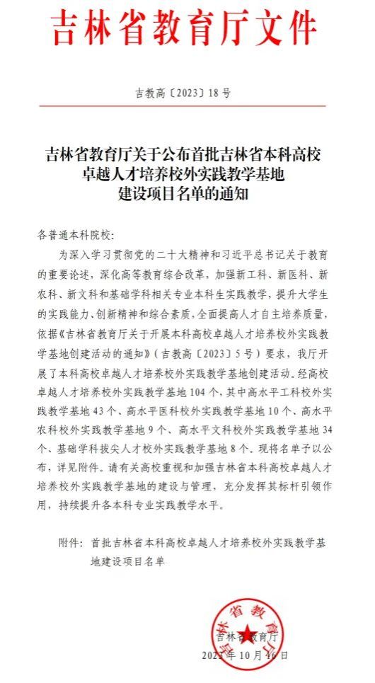 吉林省本科高校卓越人才培养校外实践教学基地评选是吉林省教育厅深入贯彻落实党的二十大精神,持续深化高等教育综合改革,加强“四新”专业本科生实践教学建设,提升大学生的实践能力、创新精神和综合素质,全面提高人才自主培养质量的有力举措。此次全省共有104 个卓越人才培养校外实践教学基地获评。