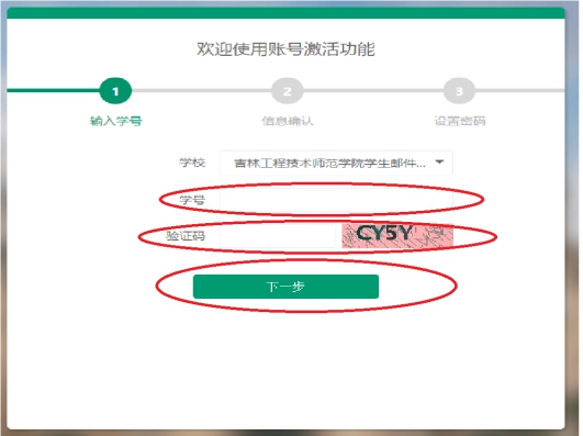 学生打开激活页面,输入学号、验证码,单击【下一步】(学号信息必须真实,非真实信息无法注册)。