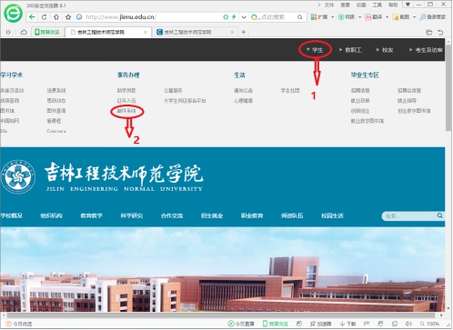 2 . 打开学校主页(http://www.jltiet.edu.cn),点击学生→邮件系统,也可登录邮件系统。