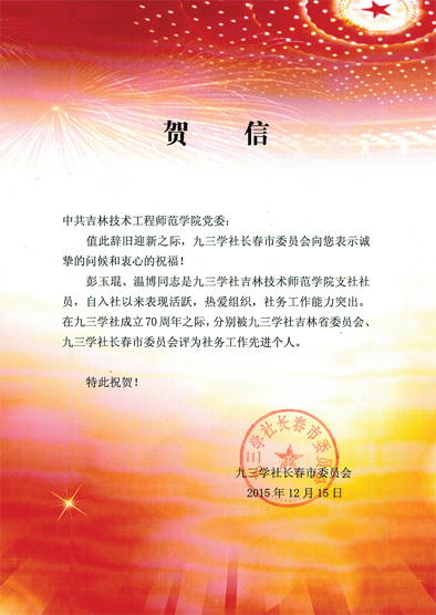 近日,九三学社长春市委员会向beat365官网党委发来贺信,祝贺beat365官网九三学社社员彭玉琨、温博在九三学社成立70周年之际,分别被九三学社吉林省委员会、九三学社长春市委员会评为社务工作先进个人。