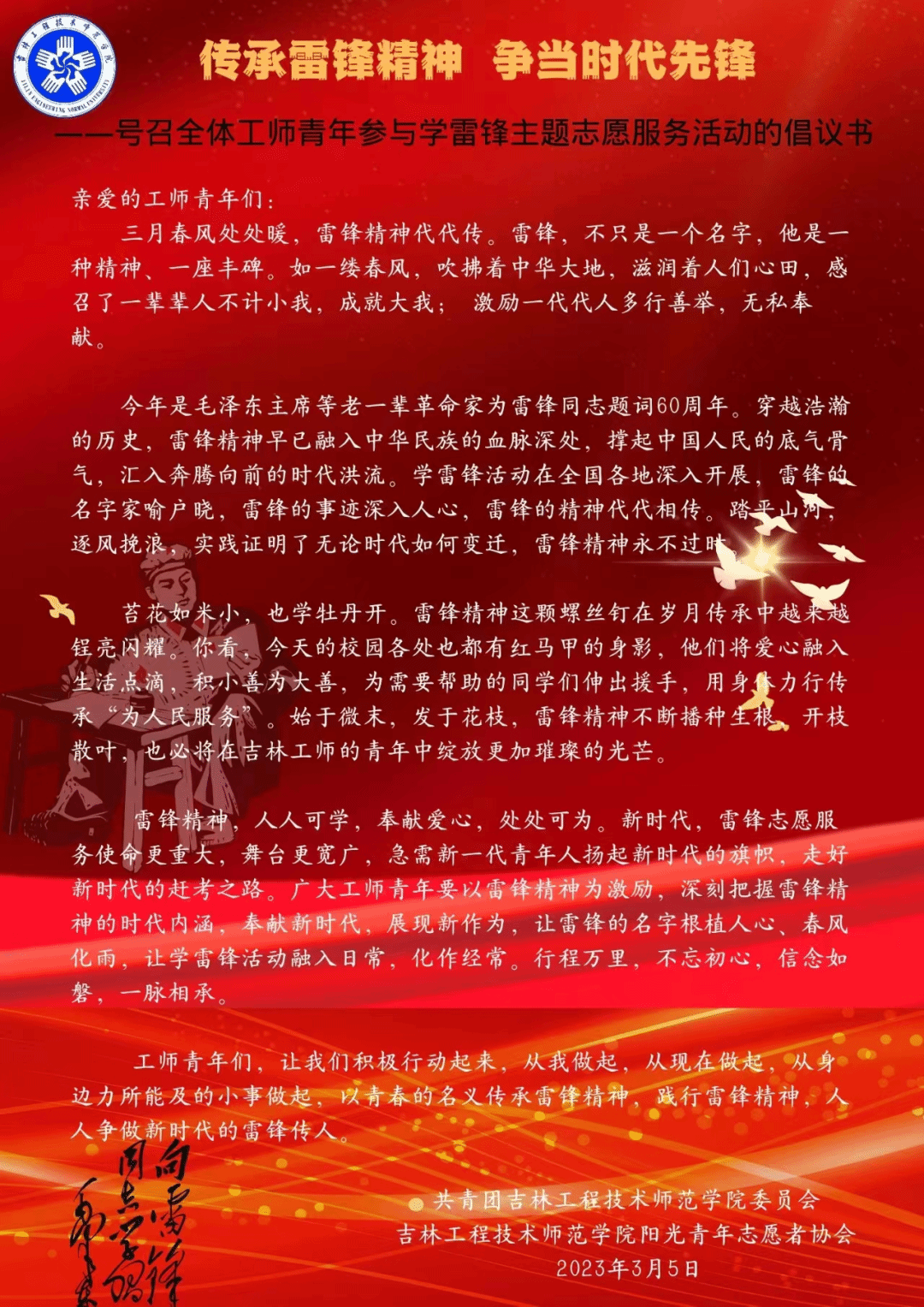 3月5日是第60个全国学雷锋纪念日,也是第24个中国青年志愿者服务日。为学习贯彻党的二十大精神,贯彻落实习近平总书记关于深入开展学雷锋活动的重要指示精神,校团委、校阳光青年志愿者协会以“传承雷锋精神 争当时代先锋”为主题,开展“学雷锋”志愿服务月活动,组织动员全校各级团组织和青年志愿服务组织积极行动,扎实开展学雷锋志愿服务系列活动,进一步弘扬雷锋精神和“奉献、友爱、互助、进步”的志愿精神,推动雷锋精神在吉林大地绽放出更加璀璨的时代光芒。...