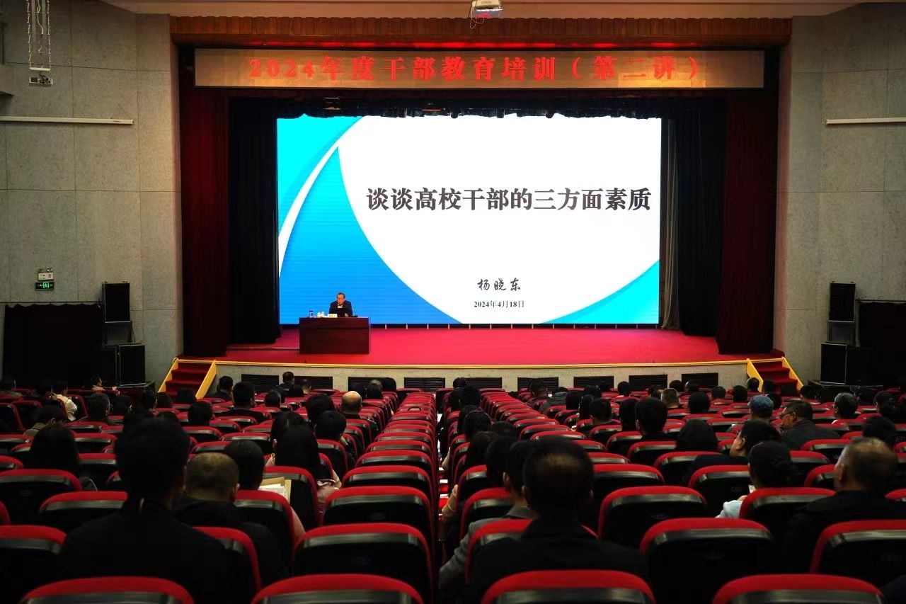 4月18日,为落实学校党纪学习教育工作安排,进一步提升学校干部素质,学校在报告厅组织了干部教育培训活动。学校党委副书记、校长杨晓东作《谈谈高校干部的三方面素质》辅导报告,全校处科级干部听取了讲座。杨晓东校长结合高校工作实践,与参会人员共勉交流:一是干部应具备政治素质,把好事业方向盘。他认为个人党性问题本质上要看公与私的关系处理,要坚定政治方向,提高政治意识,提升政治素养,准确把握政策。他结合学校党员干部自身存在的一些不足,...