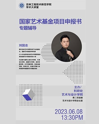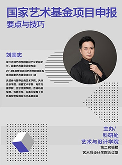主讲人:刘国志,男,吉林艺术学院教授时间、地点:2023年6月8日,艺术与设计学院会议室主办单位:艺术与设计学院、科研处讲座内容:1.国家艺术基金资助项目整体情况讲解;2.申报书结构;3.申报书内容;4.答疑解惑,强调申报时需要避免的事项。
