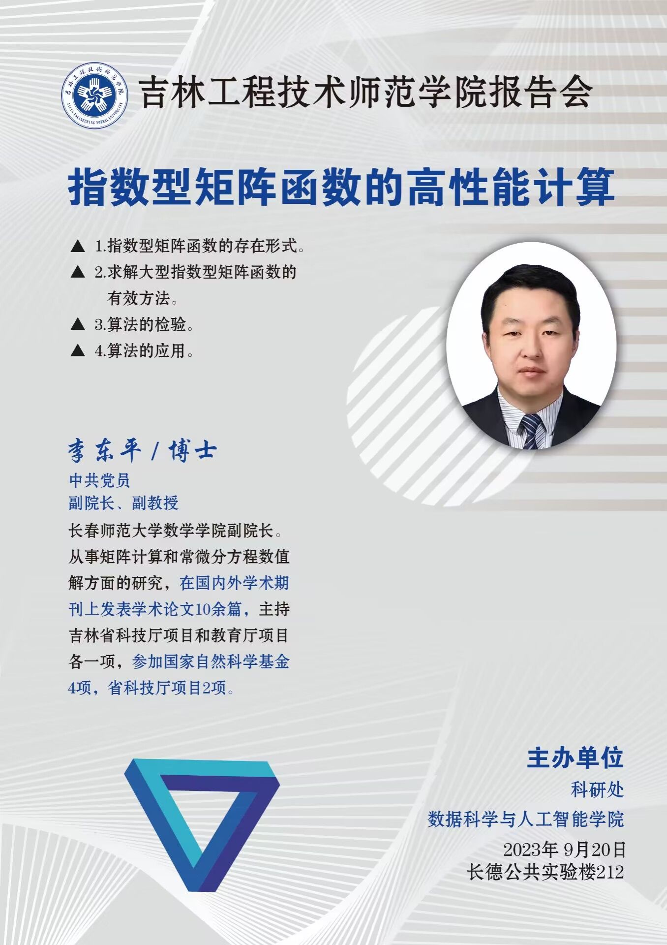 主讲人:李东平,男,长春师范大学副教授时间、地点:2023年7月4日,数据科学与人工智能学院会议室主办单位:数据科学与人工智能学院、科研处讲座内容:1.指数型矩阵函数的存在形式;2.求解大型指数型矩阵函数的有效方法;3.算法的检验;4.算法的应用
