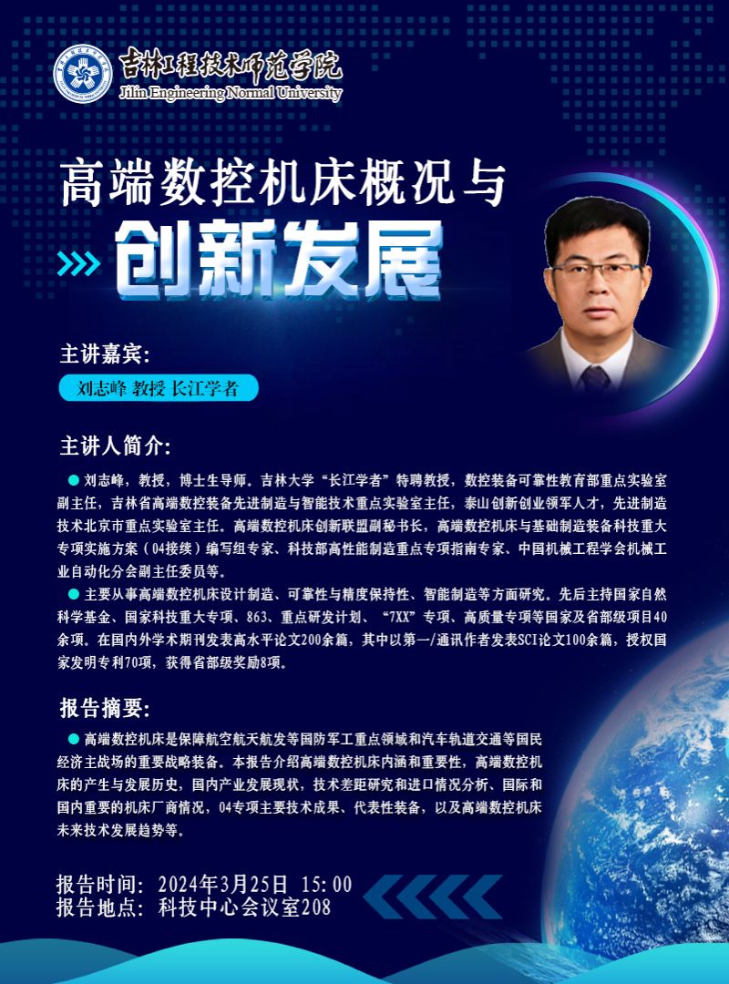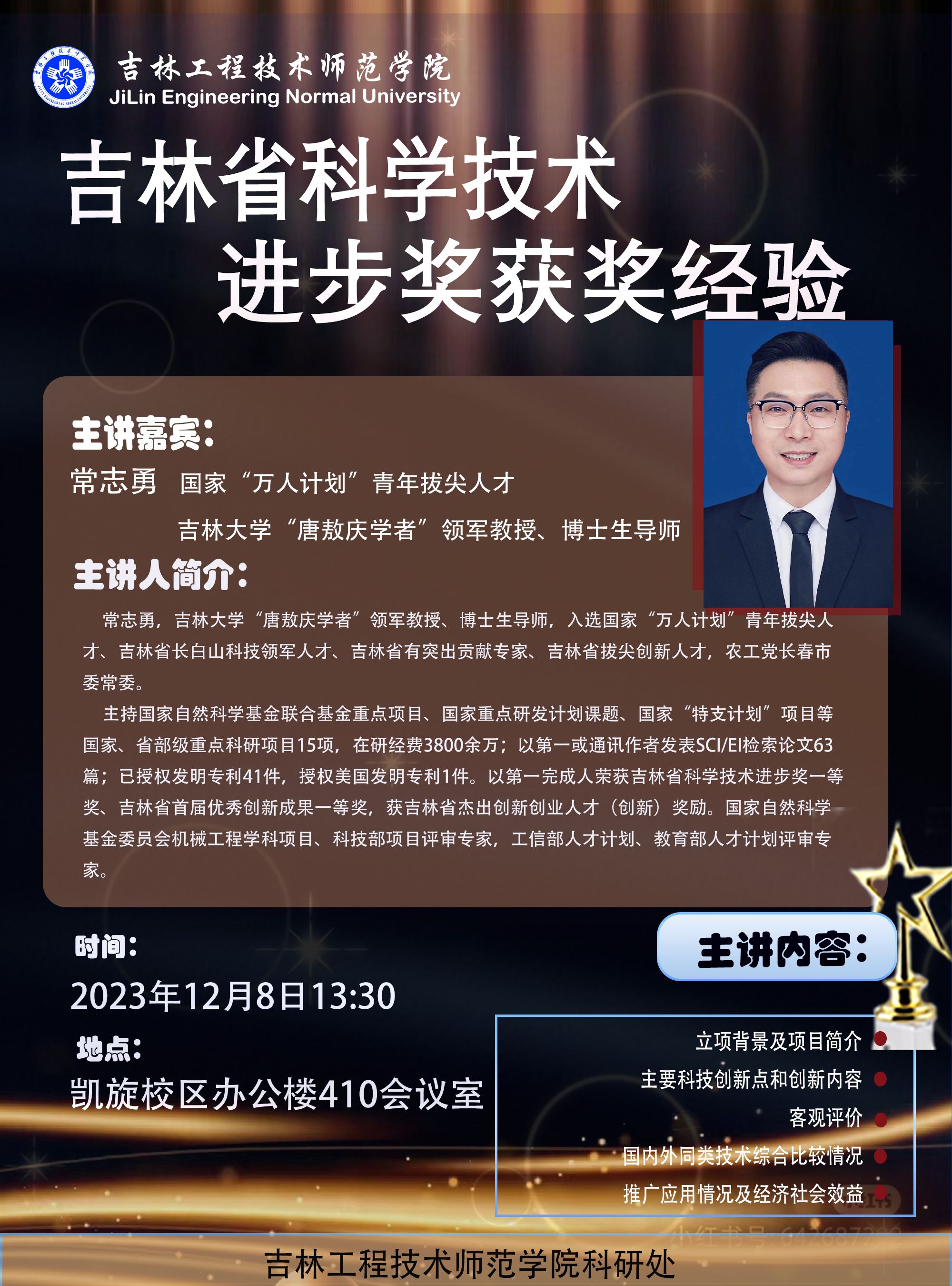 主讲人:常志勇 国家“万人计划”青年拔尖人才 吉林大学“唐敖庆学者”领军教授、博士生导师时间、地点:2023年12月8日13:30,凯旋校区办公楼410会议室主办单位:科研处讲座内容:1. 立项背景及项目简介;2. 主要科技创新点和创新内容;3. 客观评价;4. 国内外同类技术综合比较情况;5. 推广应用情况及经济社会效益。