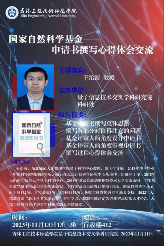 主讲人:王治海,男,东北师范大学教授时间、地点:2023年11月13日,凯旋校区办公楼412主办单位:量子信息技术交叉学科研究院、科研处讲座内容: 1. 基金申请书撰写的总体思路;2. 撰写各个部分时值得注意的问题;3. 基金评审人的角度设计申请书;4.基金评审人的角度审视申请书;5.交流国家自然科学基金撰写过程的一些心得体会。