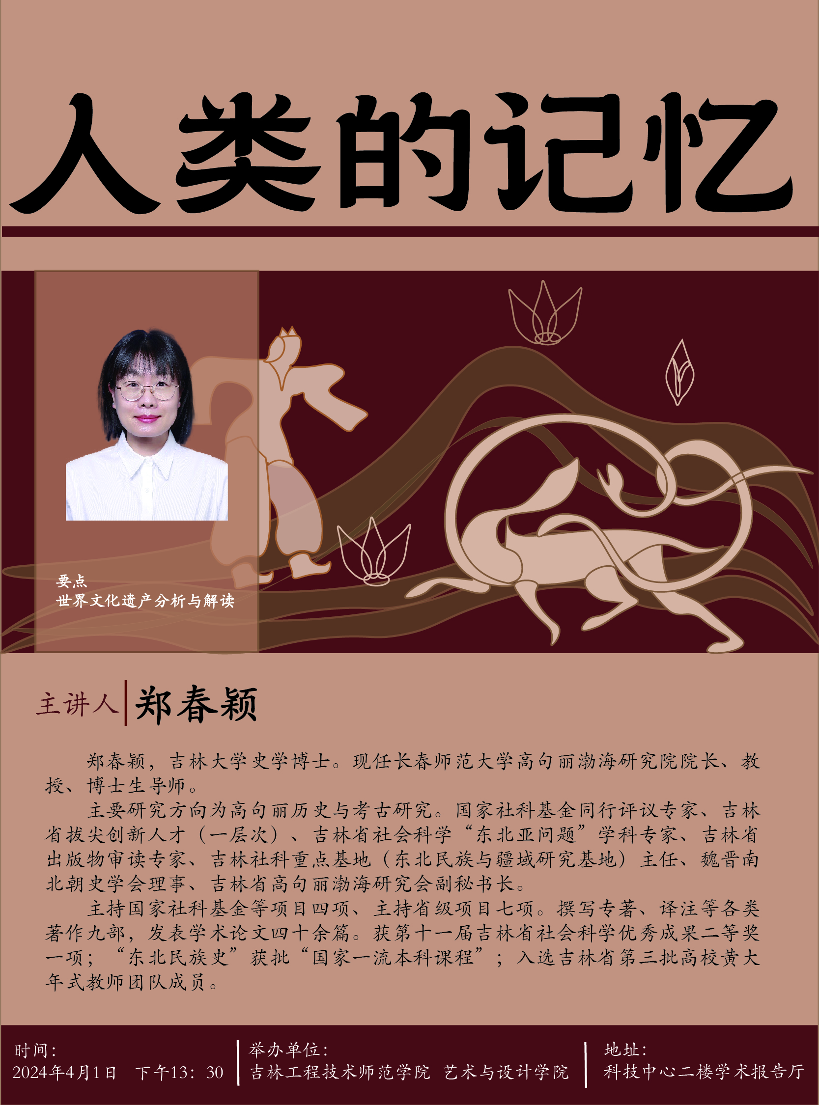 主讲人:刘国志,男,吉林艺术学院教授时间、地点:2023年11月8日,艺术与设计学院会议室主办单位:艺术与设计学院、科研处讲座内容: 1. 地域文化的重要性;2. 结合历史发展;3. 讲好地方故事。