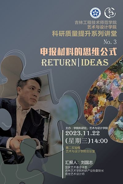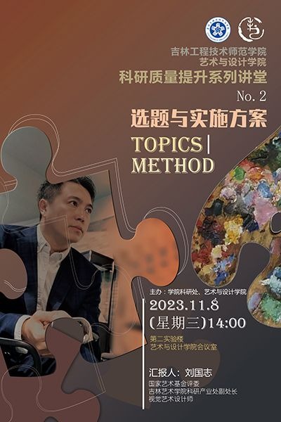 主讲人:刘国志,男,吉林艺术学院教授时间、地点:2023年11月22日,艺术与设计学院会议室主办单位:艺术与设计学院、科研处讲座内容: 1. 文本的作用;2. 结构的设计;3. 特色的凝练。