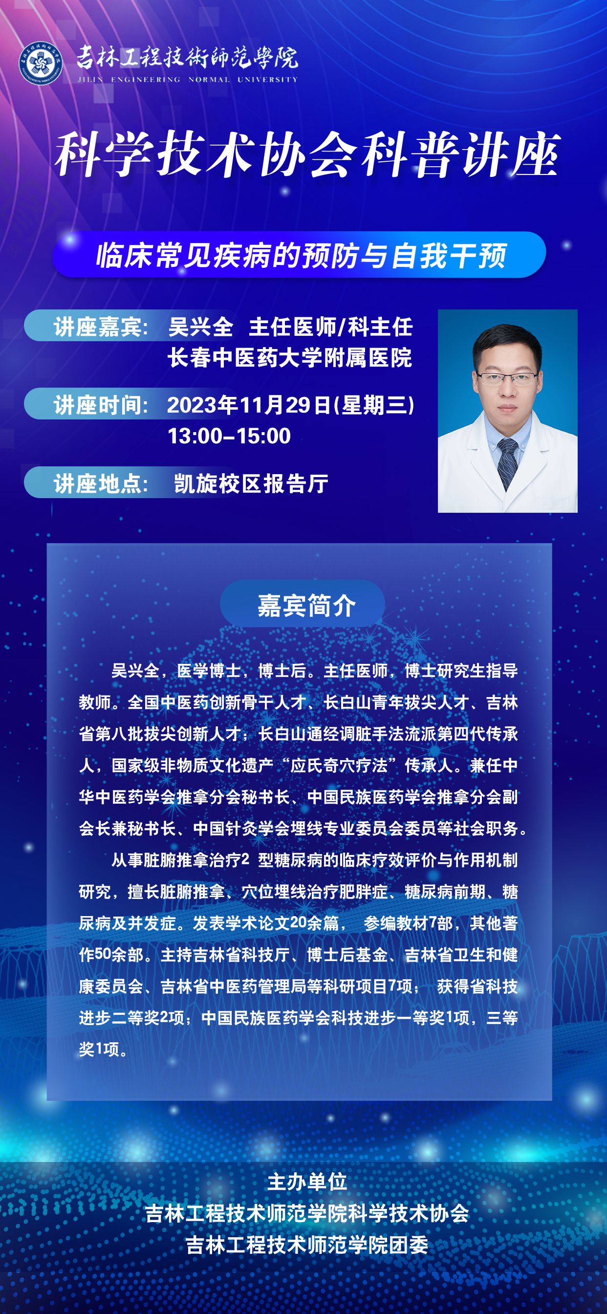 主讲人:吴兴全,男,长春中医药大学附属医院主任时间、地点:2023年11月29日,凯旋校区报告厅主办单位:科学技术协会、团委、科研处讲座内容: 1.临床常见脊柱相关疾病与预防;2.临床常见内科相关疾病与预防;3.临床常见皮肤相关疾病与预防;4.脏腑推拿的应用。