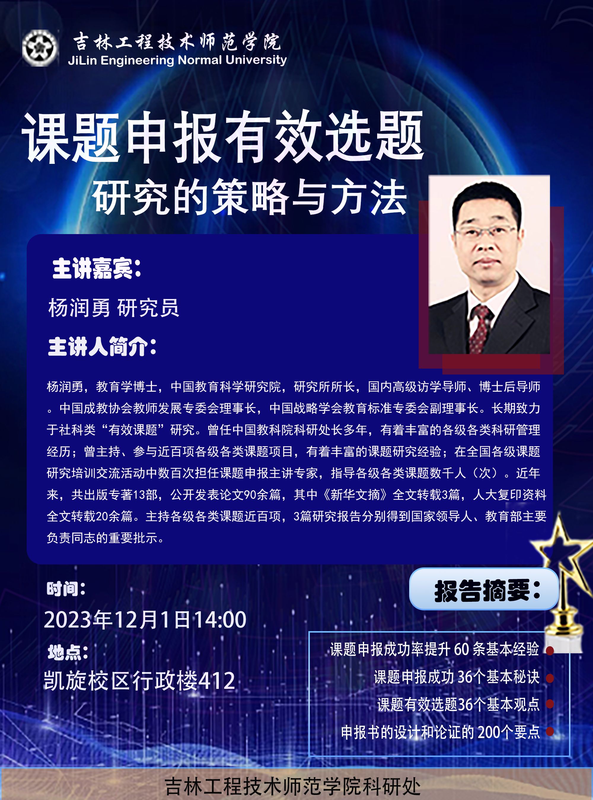主讲人:杨润勇,男,中国教育科学研究院时间、地点:2023年12月1日,凯旋校区行政楼412主办单位:科研处讲座内容:1:课题申报成功率提升 60 条基本经验;2:课题申报成功 36个基本秘诀;3:课题有效选题36个基本观点;4:申报书的设计和论证的 200个要点。